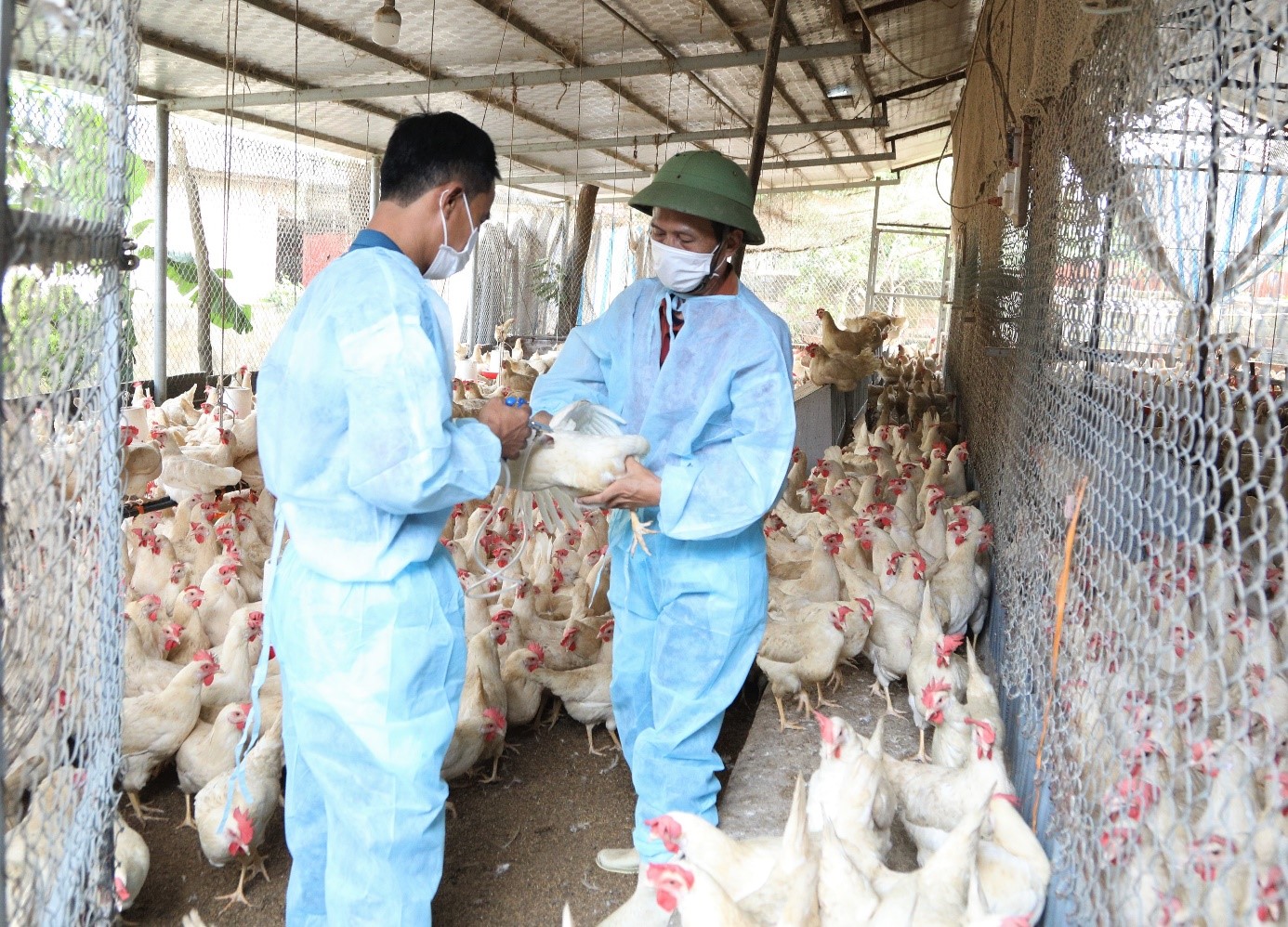 Cán bộ thú y tiêm phòng cho đàn gia cầm trên địa bàn xã Thái Hòa