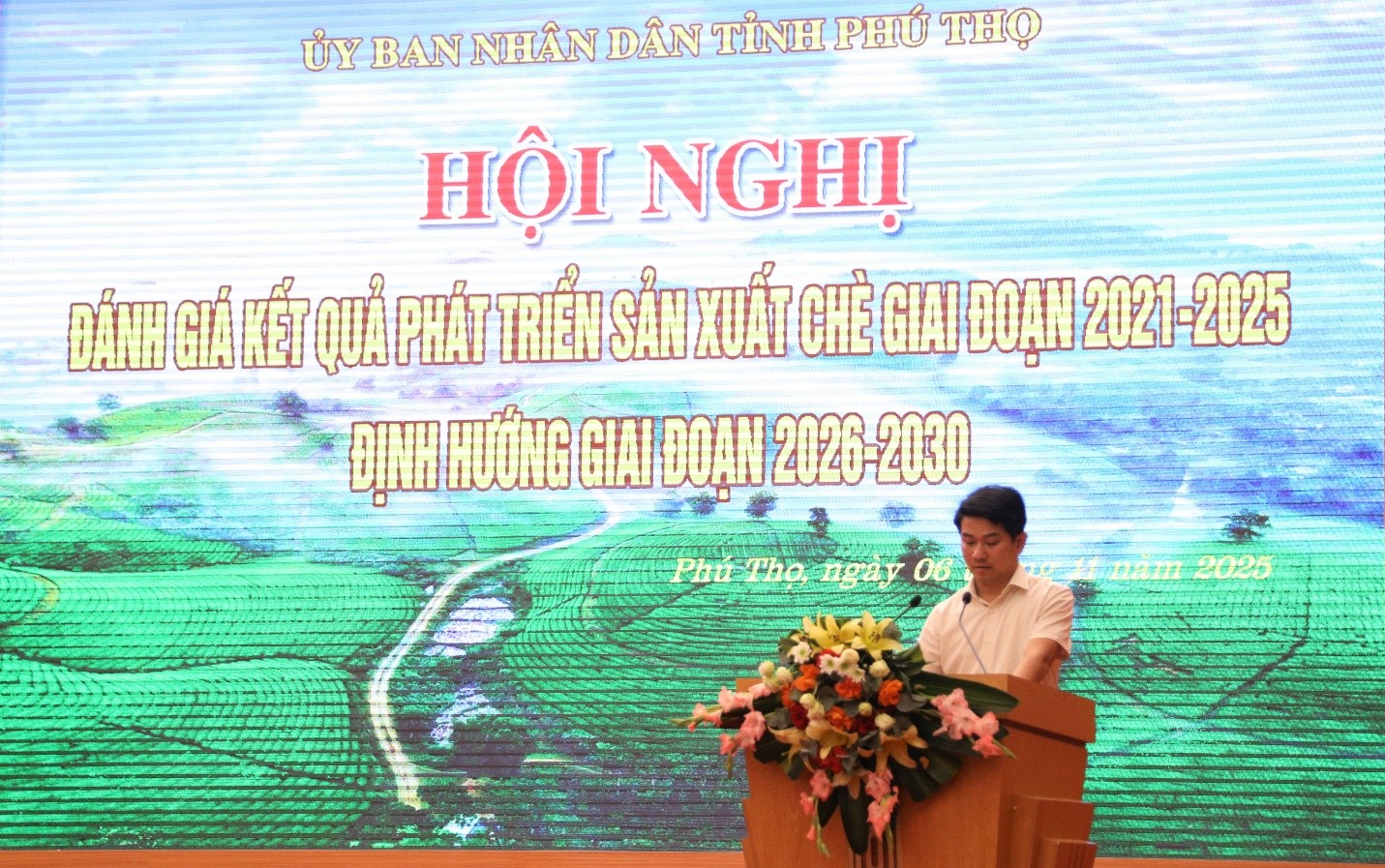 Sáng ngày 06/11/2025, tại Trung tâm hội nghị tỉnh UBND tỉnh Phú Thọ tổ chức Hội nghị đánh giá kết quả phát triển sản xuất chè giai đoạn 2021 – 2025, định hướng giai đoạn 2026 - 2030. Đồng chí Đinh Công Sứ, Tỉnh ủy viên, Phó Chủ tịch UBND tỉnh chủ trì hội nghị; tham dự hội nghị có các đồng chí Hoàng Đình Tráng, Phó Giám đốc Sở Nông nghiệp và Môi trường; lãnh đạo các sở: Tài chính, Khoa học Công nghệ, Công thương, Văn hóa, Thể thao và Du lịch; đại diện các phòng, ban, đơn vị trực thuộc Sở Nông nghiệp và Môi trường; đại diện Hiệp hội chè Việt Nam, Tổng công ty chè Việt Nam; mội số doanh nghiệp sản xuất chế biến chè và một số xã có diện tích trồng chè lớn trên địa bàn tỉnh.