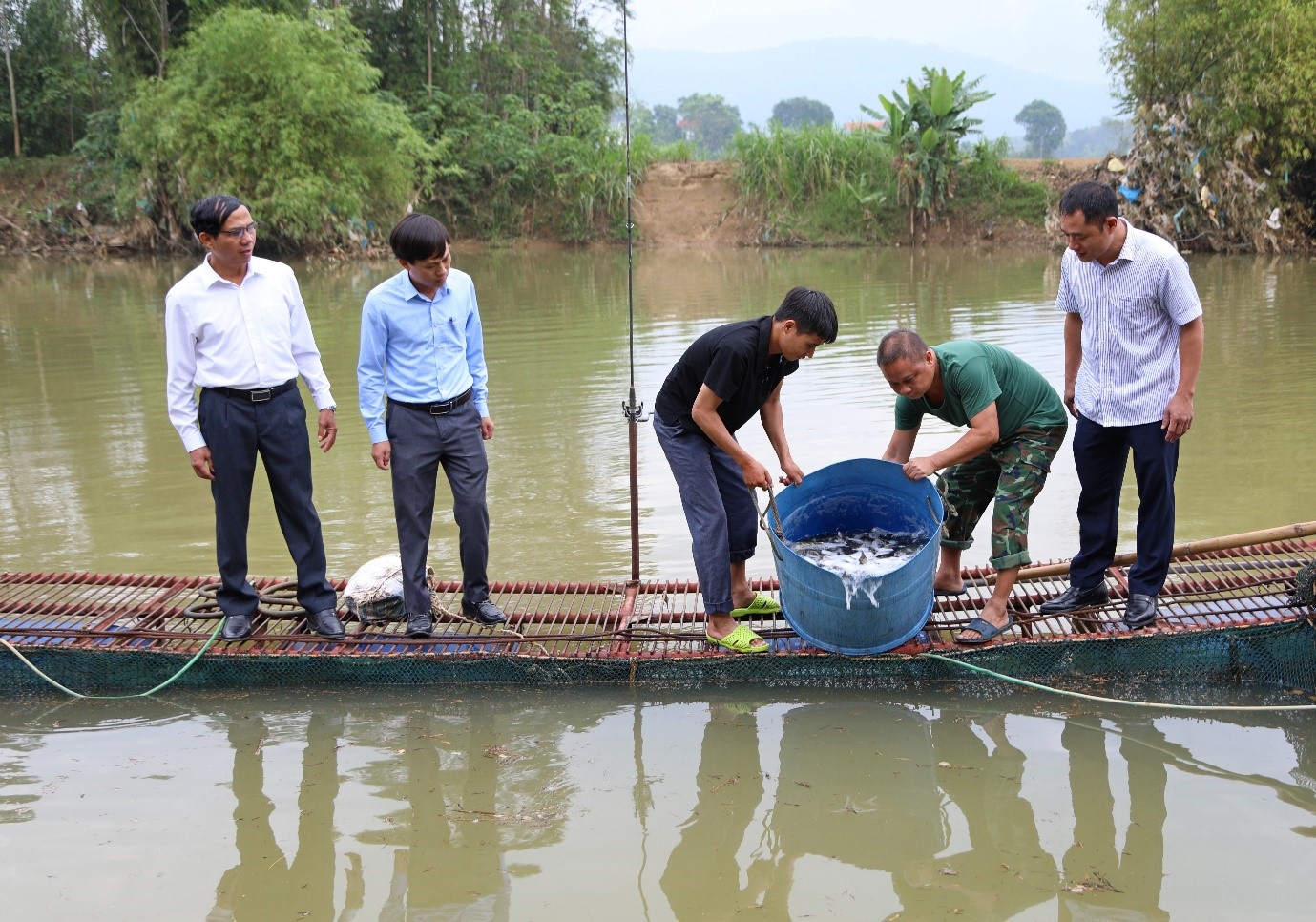 Đại diện Trung tâm Khuyến nông tỉnh, đại diện UBND xã Thái Hoà kiểm tra cá thả nuôi trong lồng