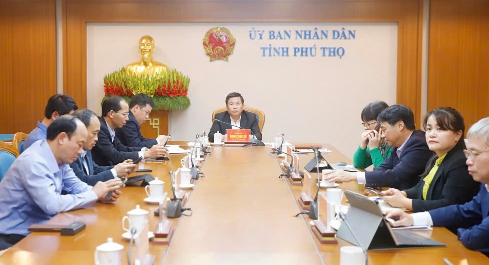 Đồng chí Đinh Công Sứ, Tỉnh Uỷ viên, Phó Chủ tịch UBND tỉnh và các đại biểu tham dự hội nghị tại điểm cầu UBND tỉnh Phú Thọ