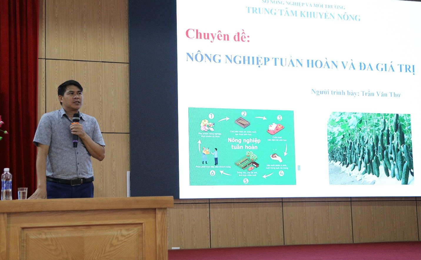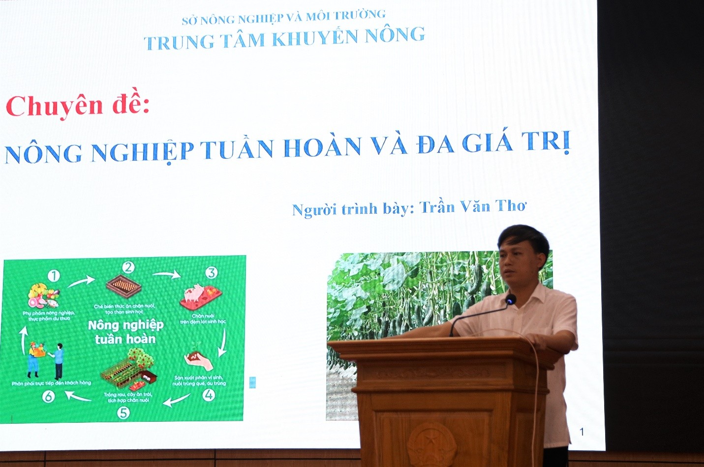 Đồng chí Trần Văn Thơ, Phó Giám đốc Trung tâm Khuyến nông Phú Thọ trình bày nội dung nông nghiệp tuần hoàn và đa giá trị tại hội nghị